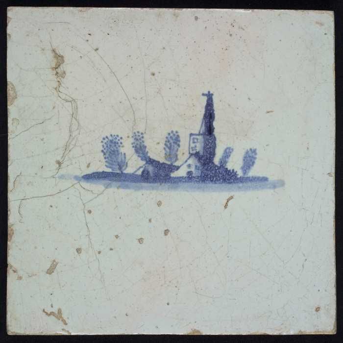 Tafereeltegel, blauw, dorp en kerktoren, geen hoekmo...