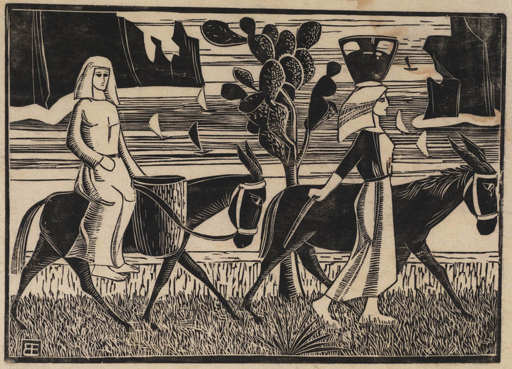 Landschap met twee vrouwen met ezels