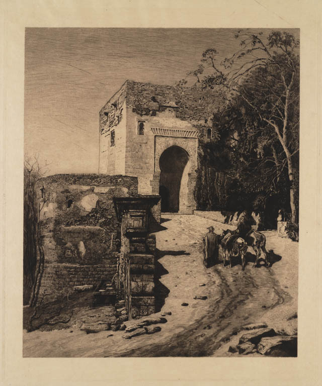 Oosterse stadspoort met twee mannen met paarden