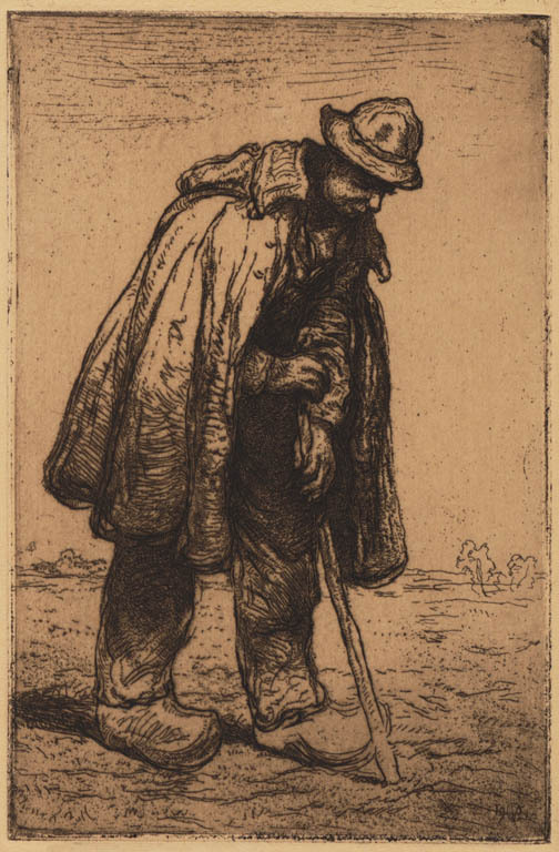 Boer, leunend op een stok (of een spade?)