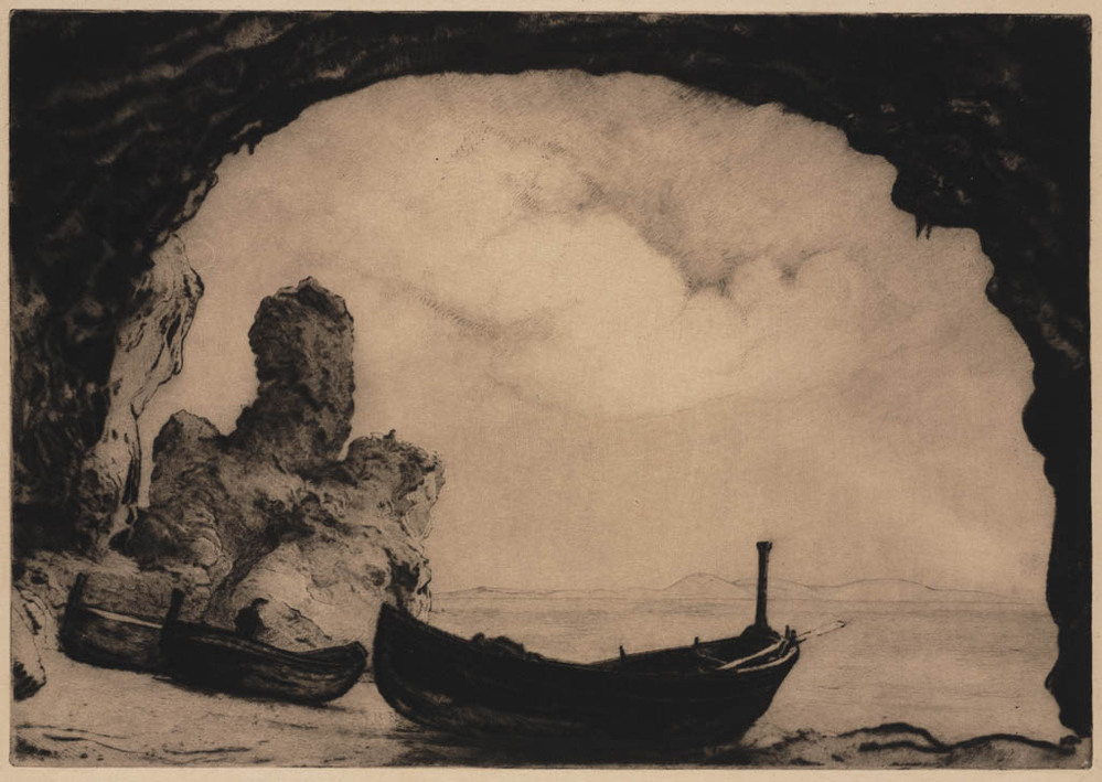 Roeiboten op het strand onder een grot