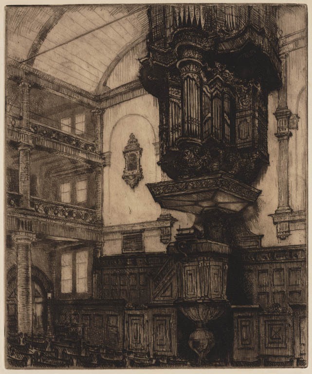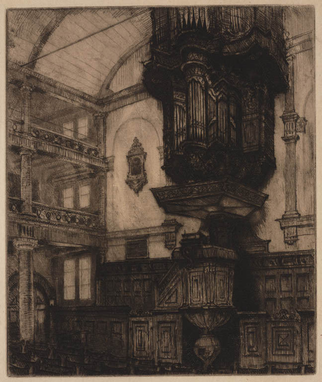 Interieur van een kerk met preekstoel en orgel