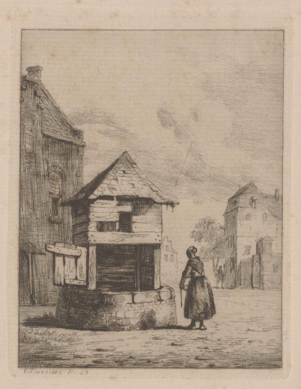 Meisje bij een waterput in een stad