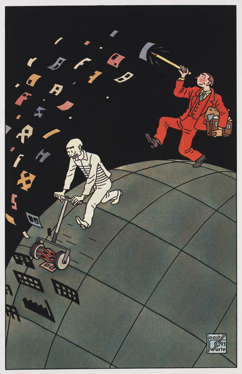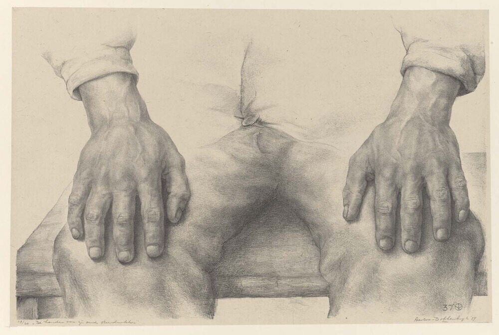 De handen van zijn (?) oude steendrukker
