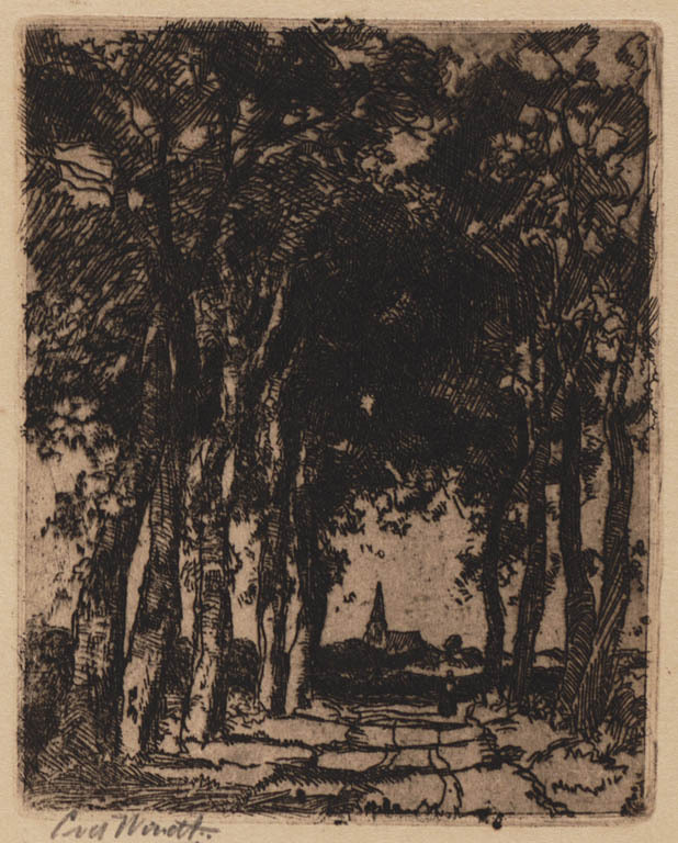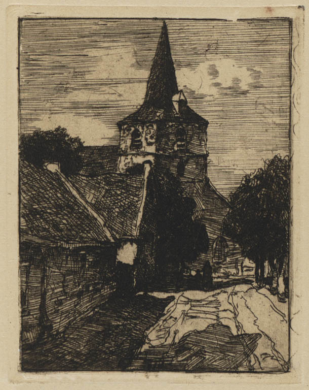 Laantje met bomen en een kerktoren
