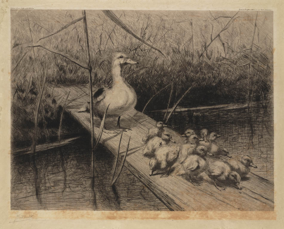 Eend met jongen op een plank over een sloot