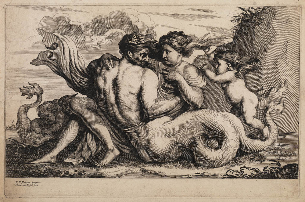 Een nimf en een triton in omhelzing