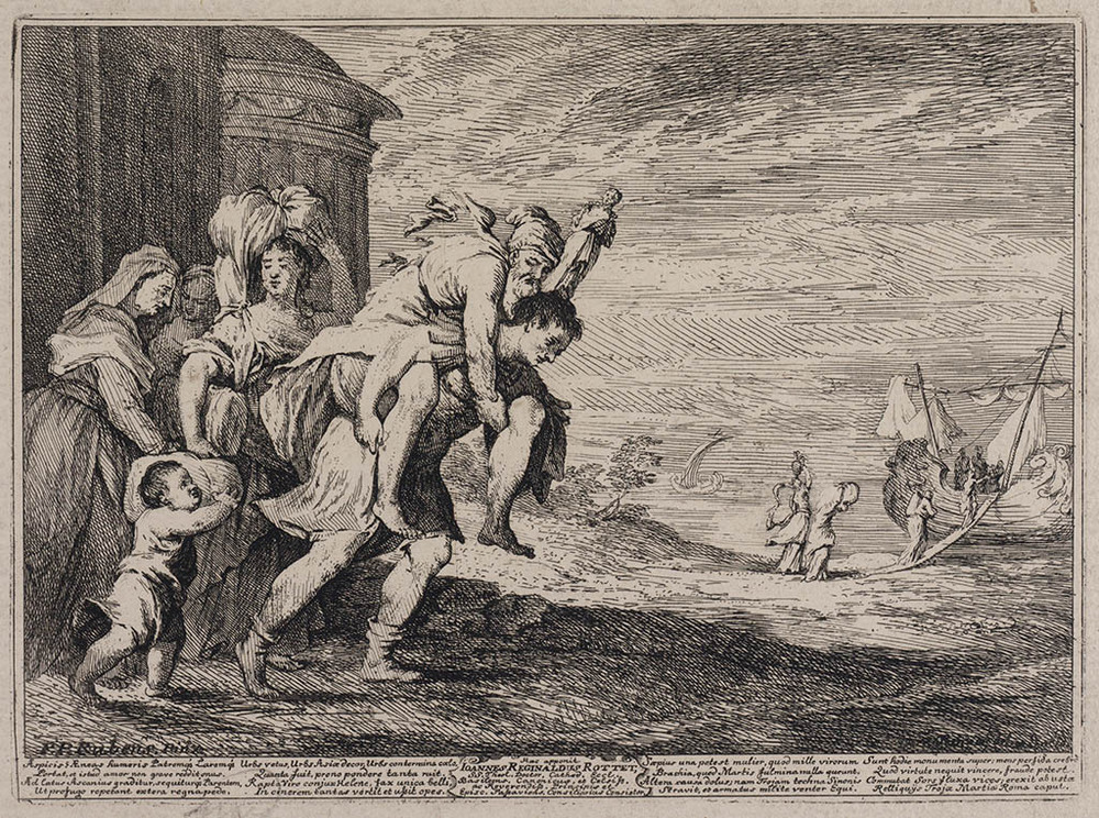 Aeneas vlucht weg met zijn familie en zijn vader bij...