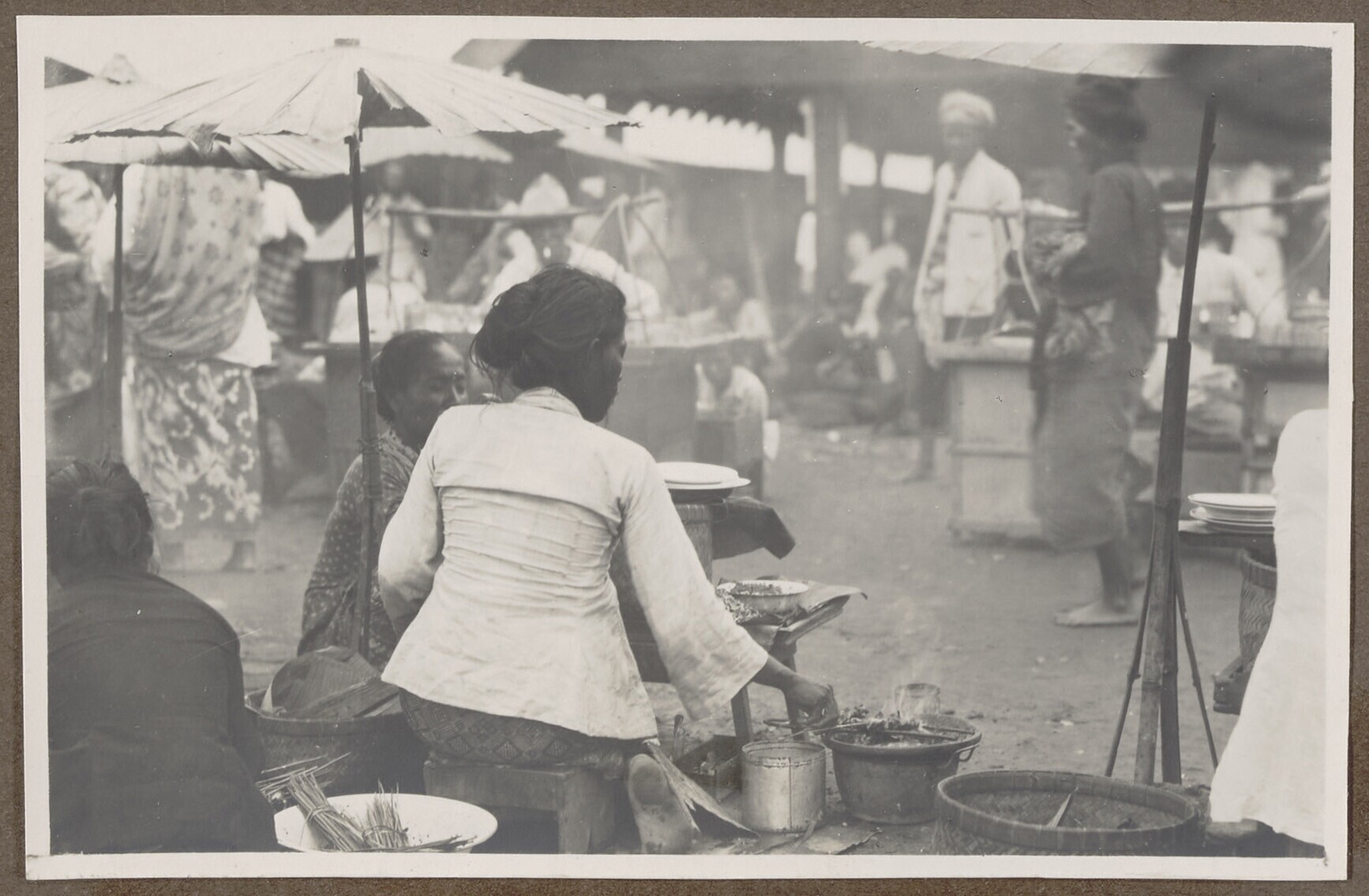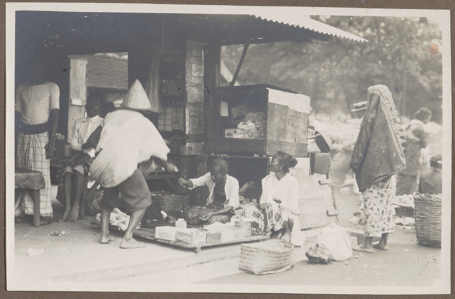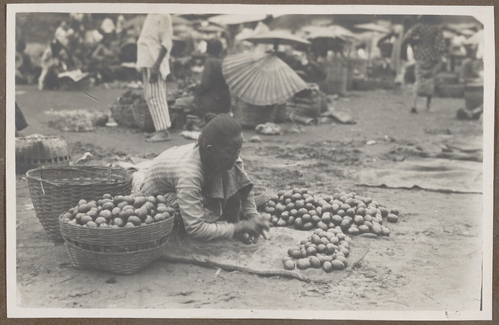 Marktvrouwen met hun waar op de markt in de benlenst...