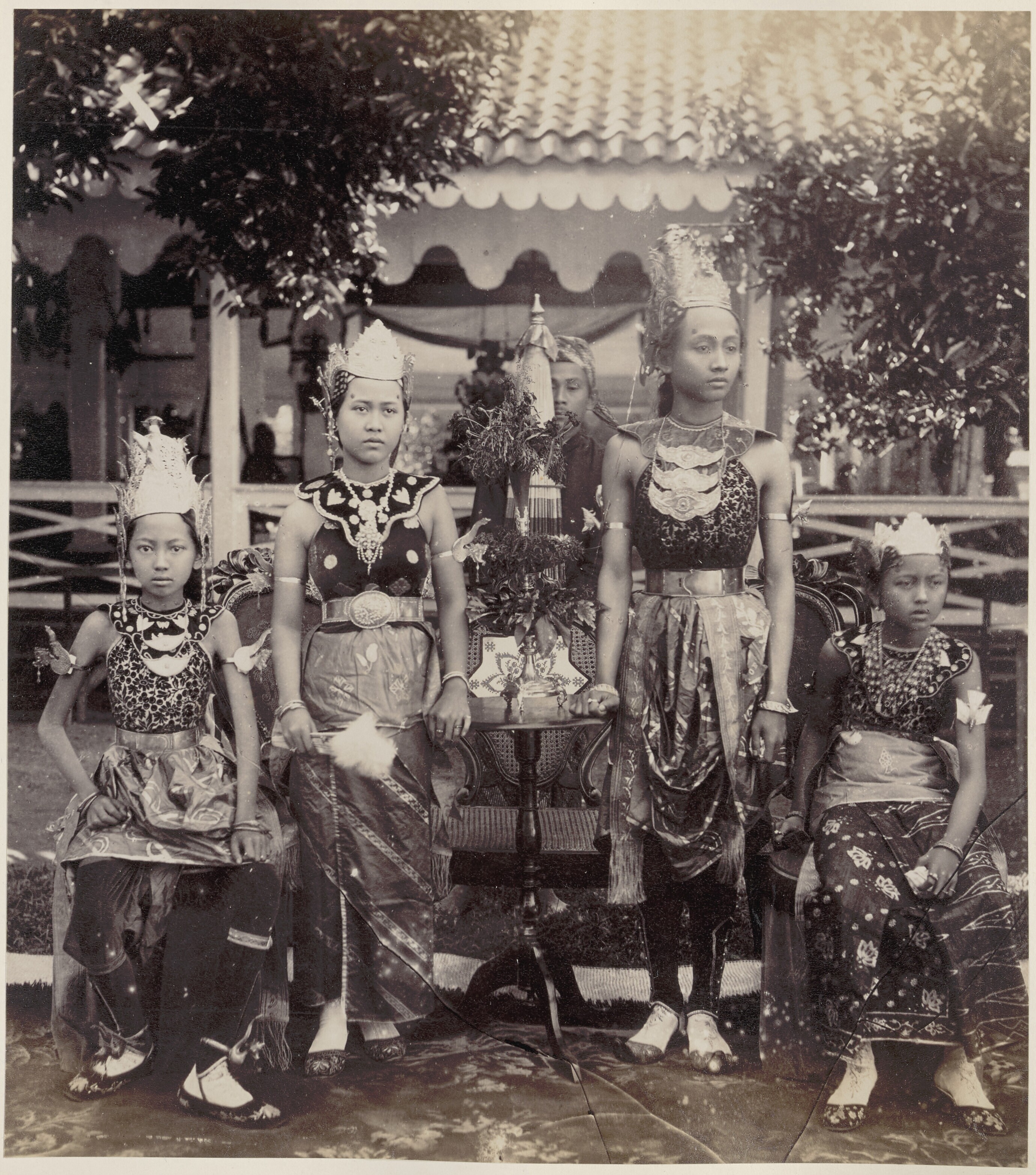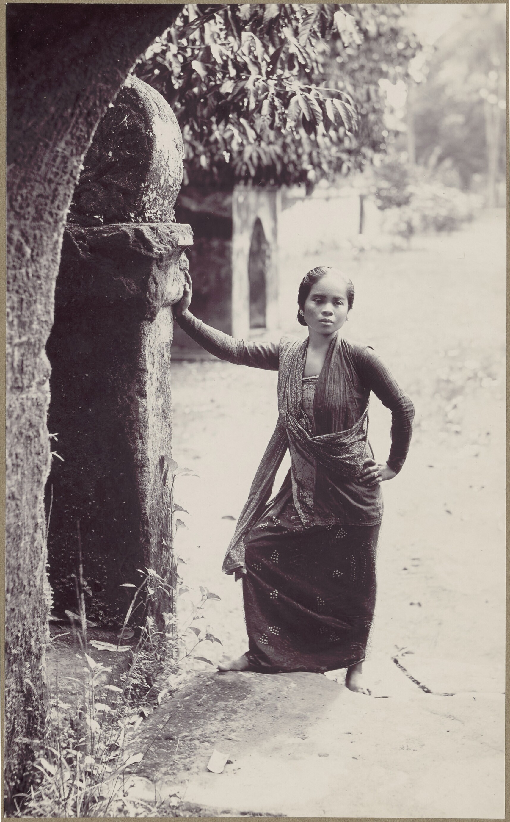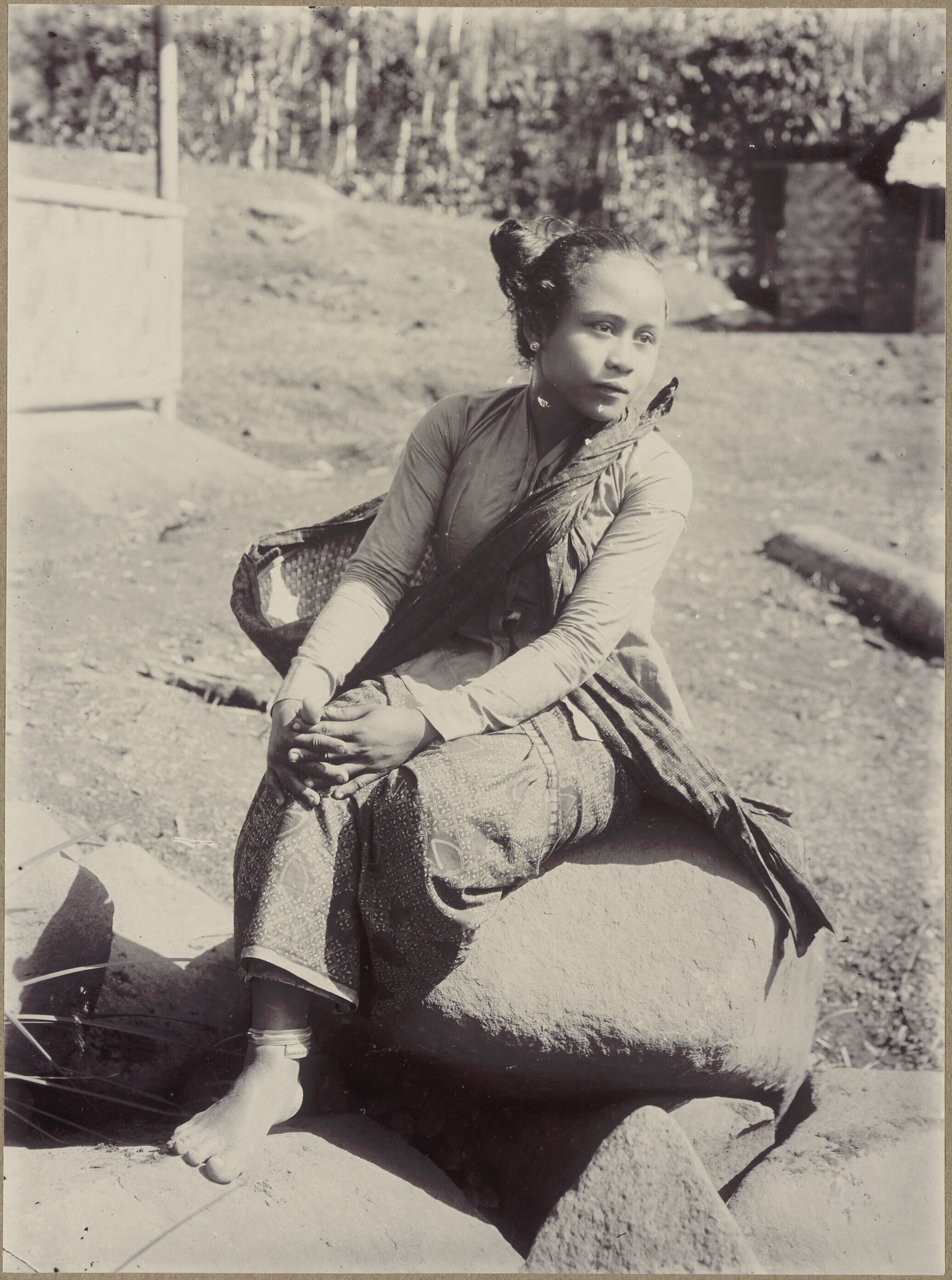 Javaanse vrouw met bloemenhoofdtooi in een boomstamk...