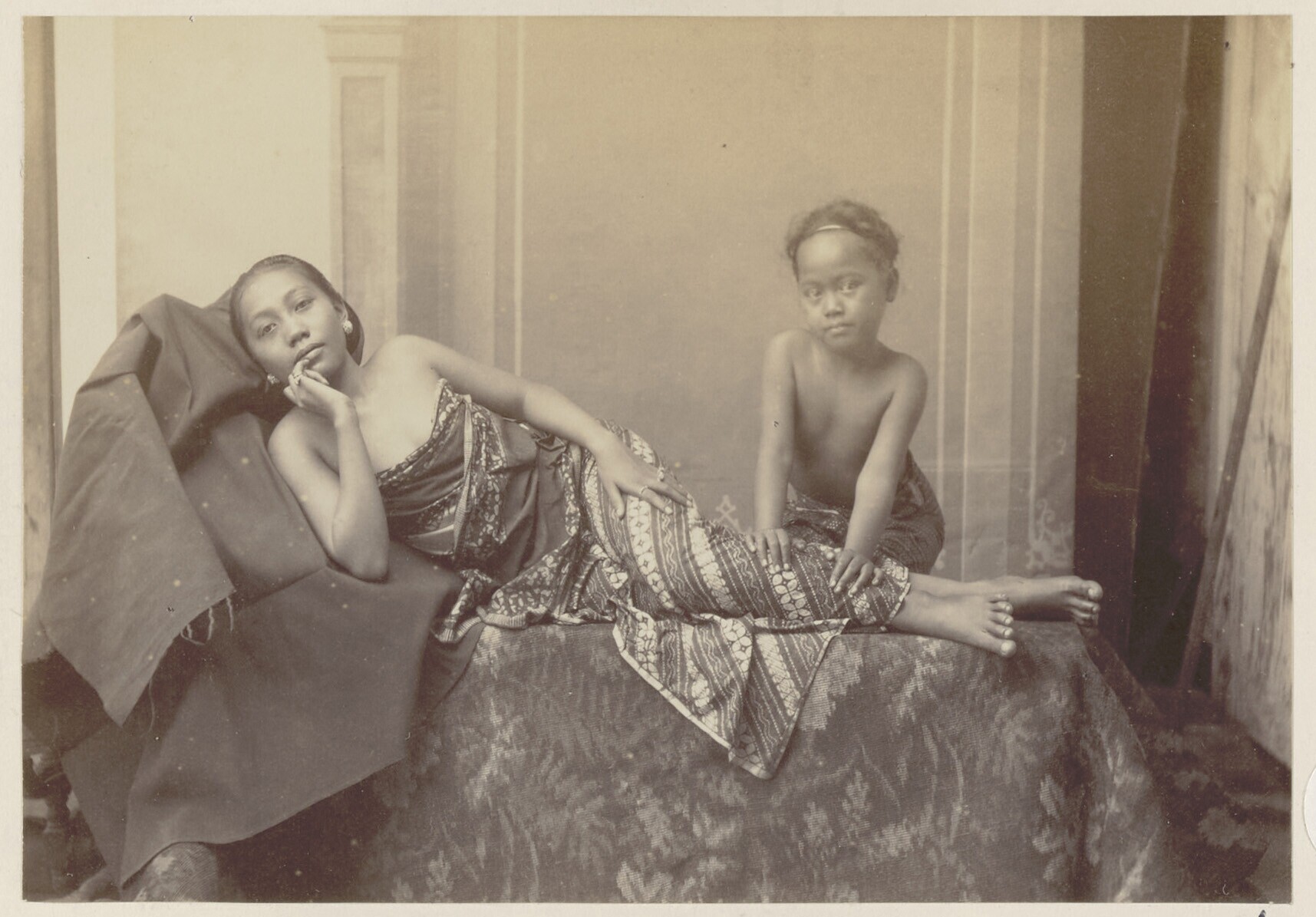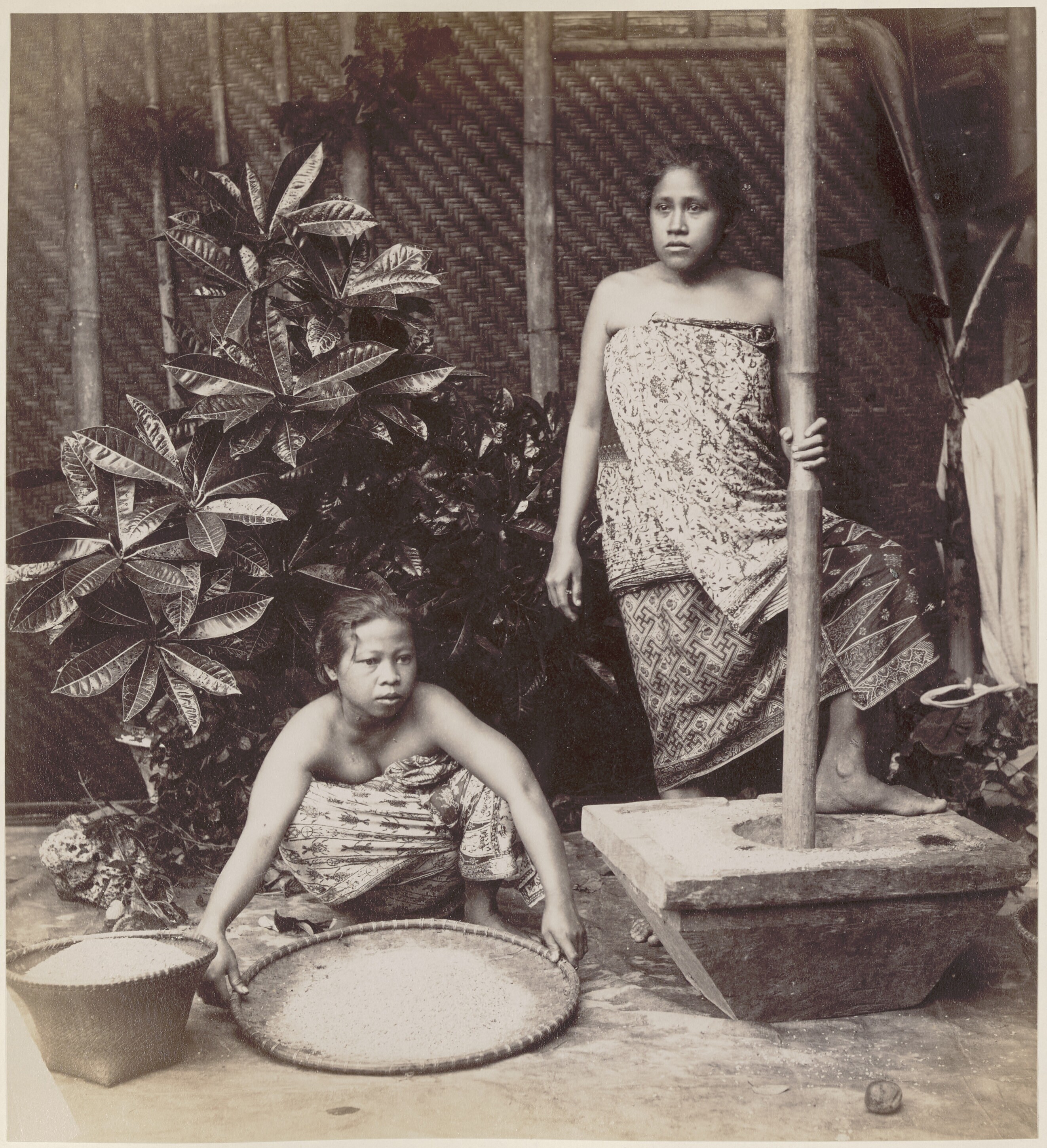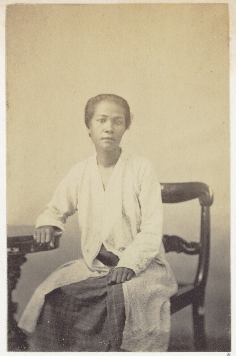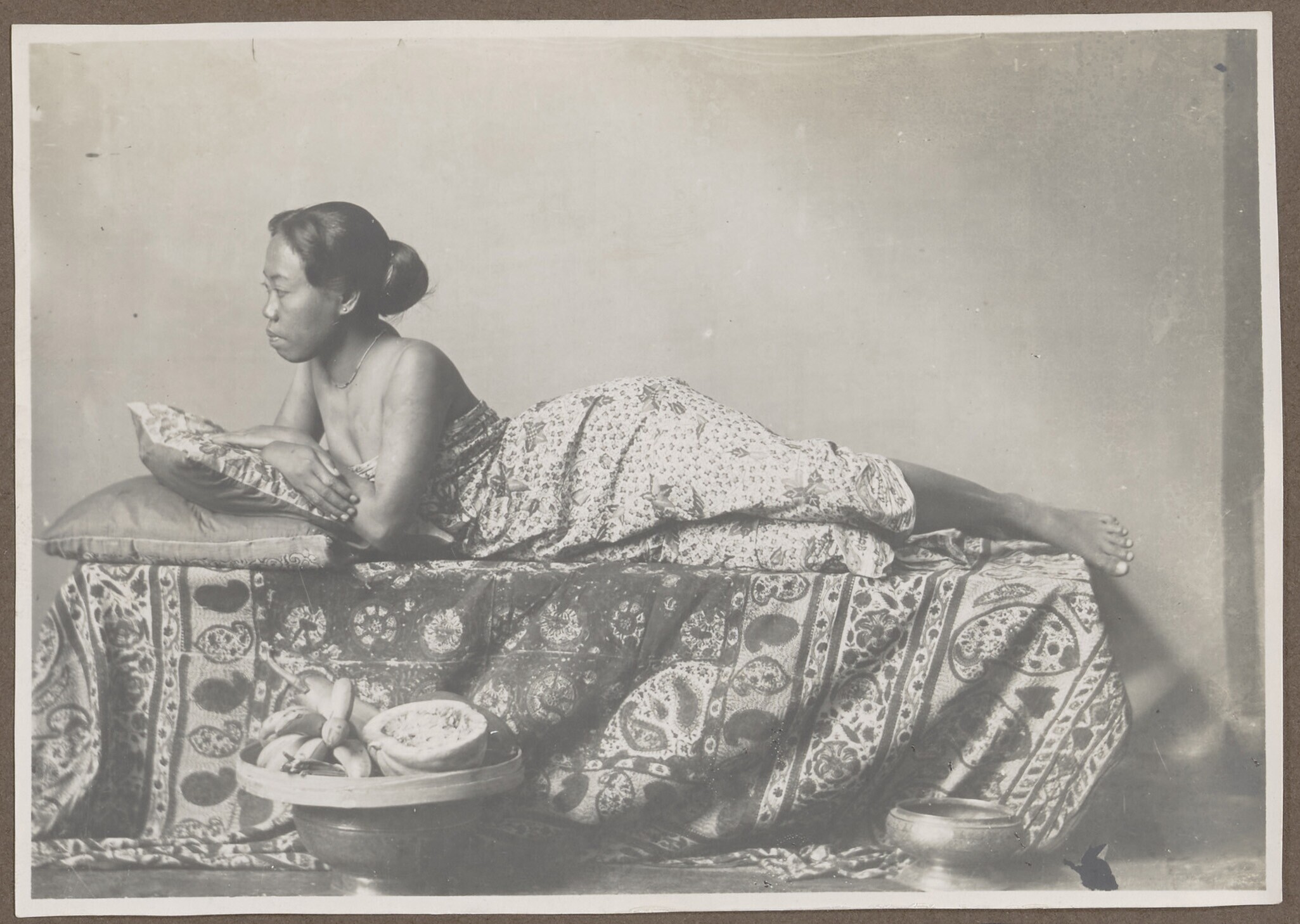 Javaanse vrouw met bloemenhoofdtooi in een boomstamk...