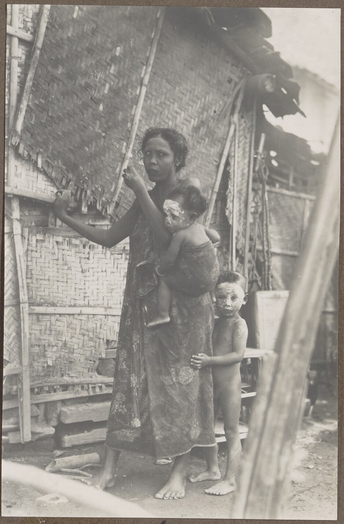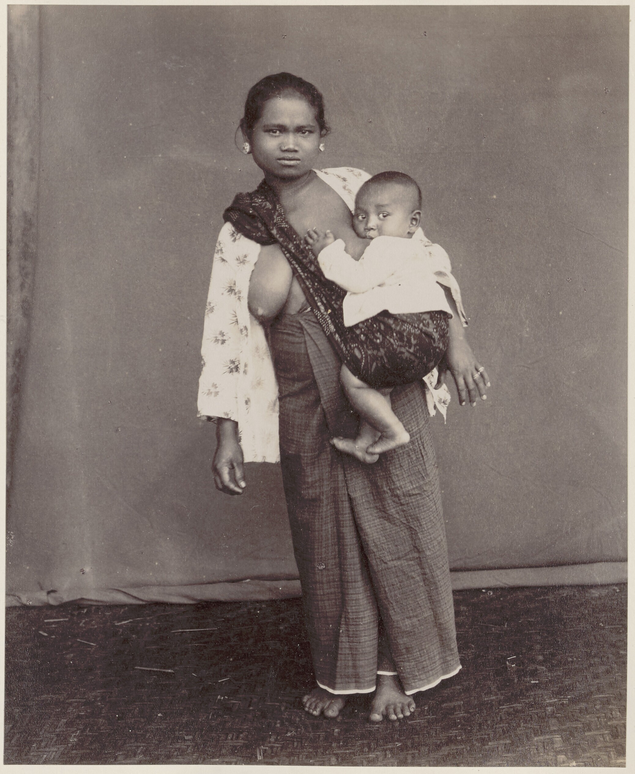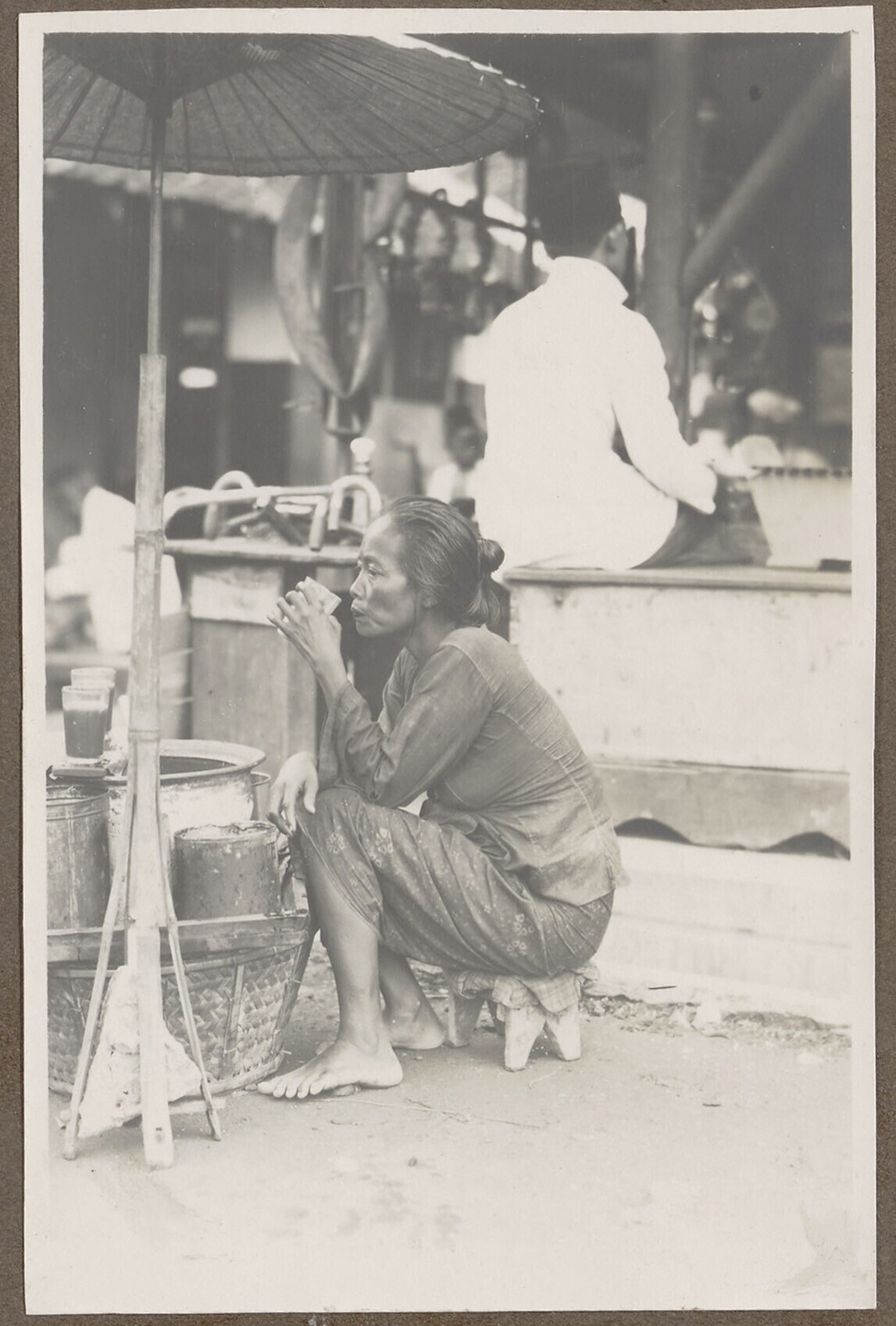 Een vrouw met een mand in een draagdoek, Jogjakarta.