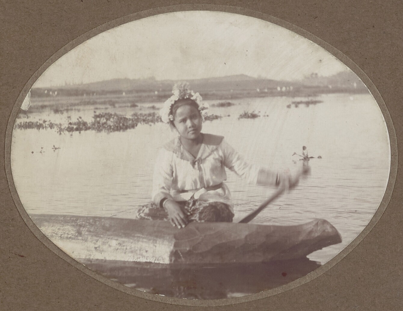 Javaanse meisjes in boomstamkano`s op het meer van B...