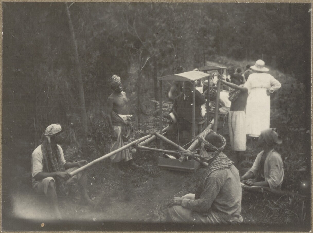 Mr and mrs Boekenoogen-Vis and the sedan chair in wh...