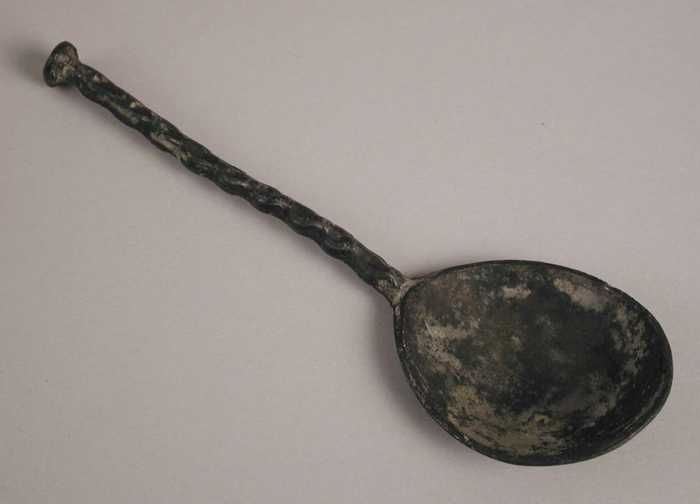 Tinnen lepel, gemerkt, rechte steel met knobbels en ...