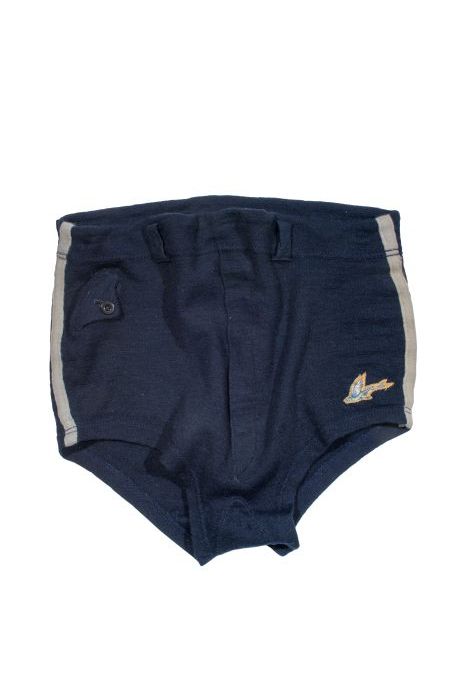 Donkerblauwe gebreide zwembroek met witte bies langs...