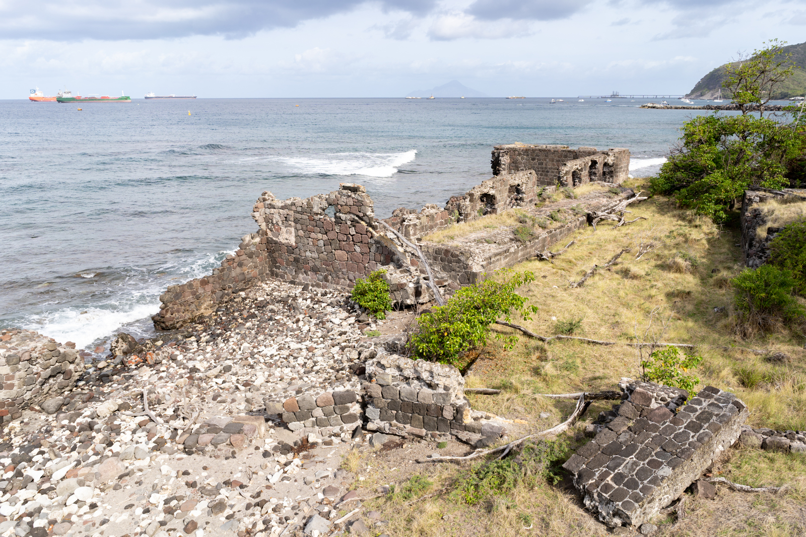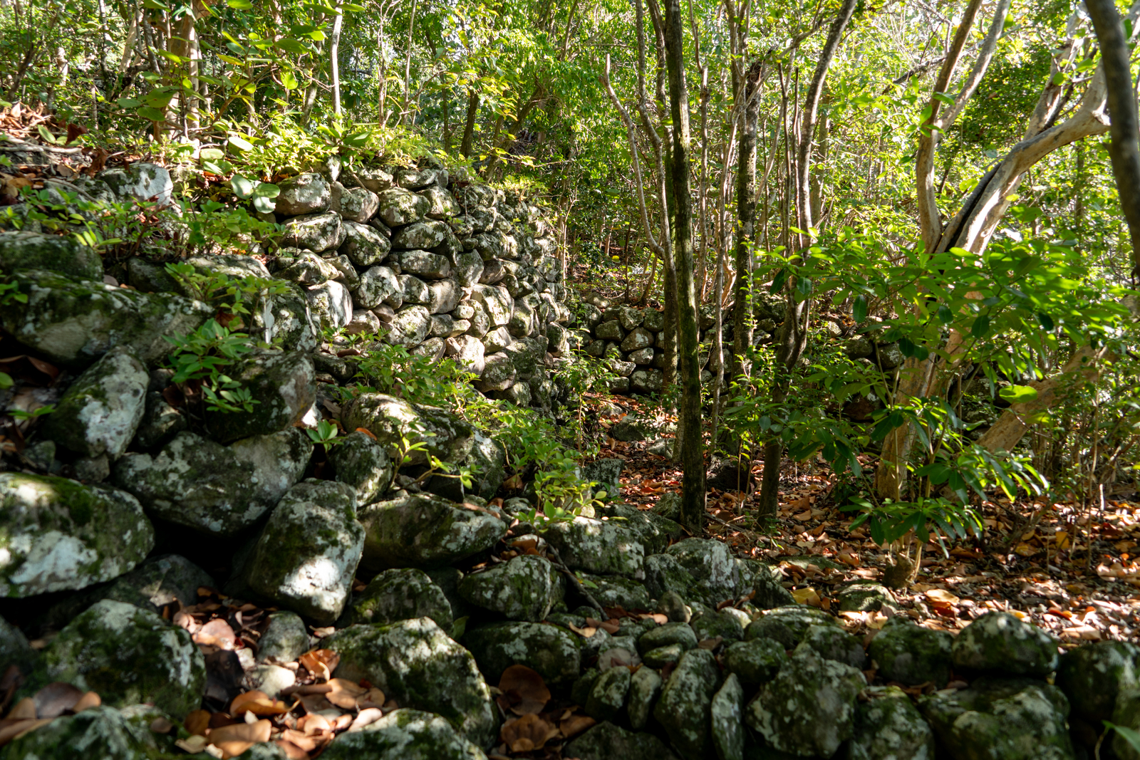 Een terrasmuur van het verlaten dorp Mary's Point.