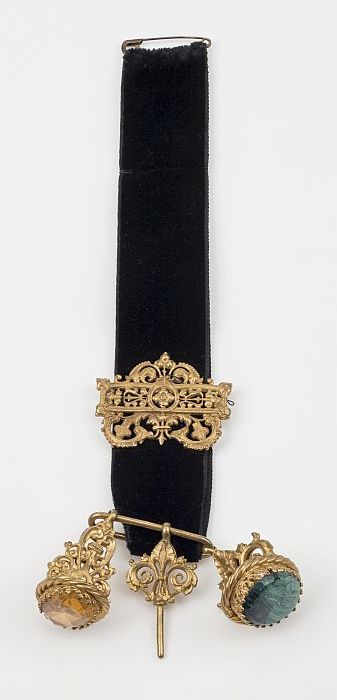 Zwart fluwelen band met twee spelden met goudkleurig...