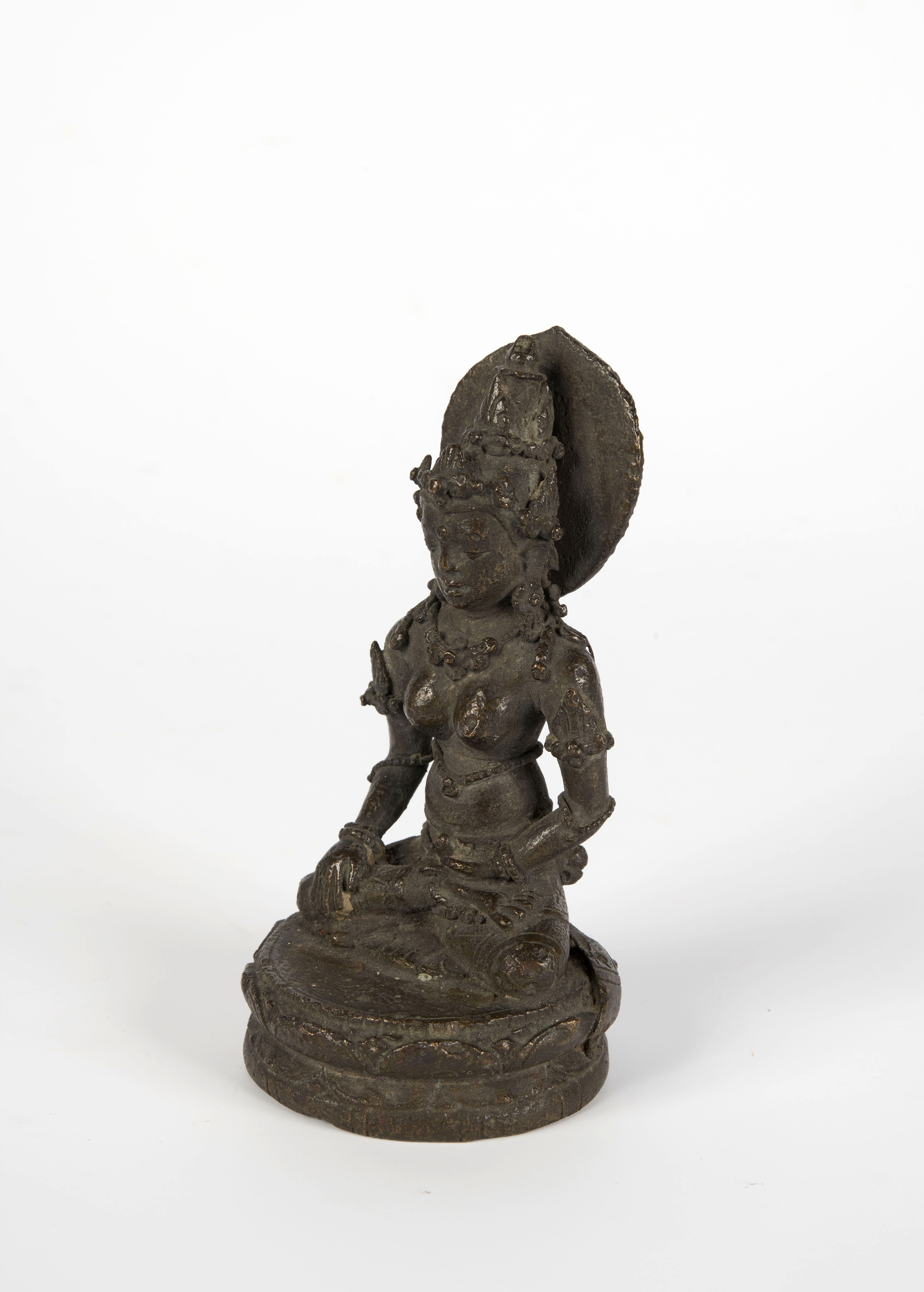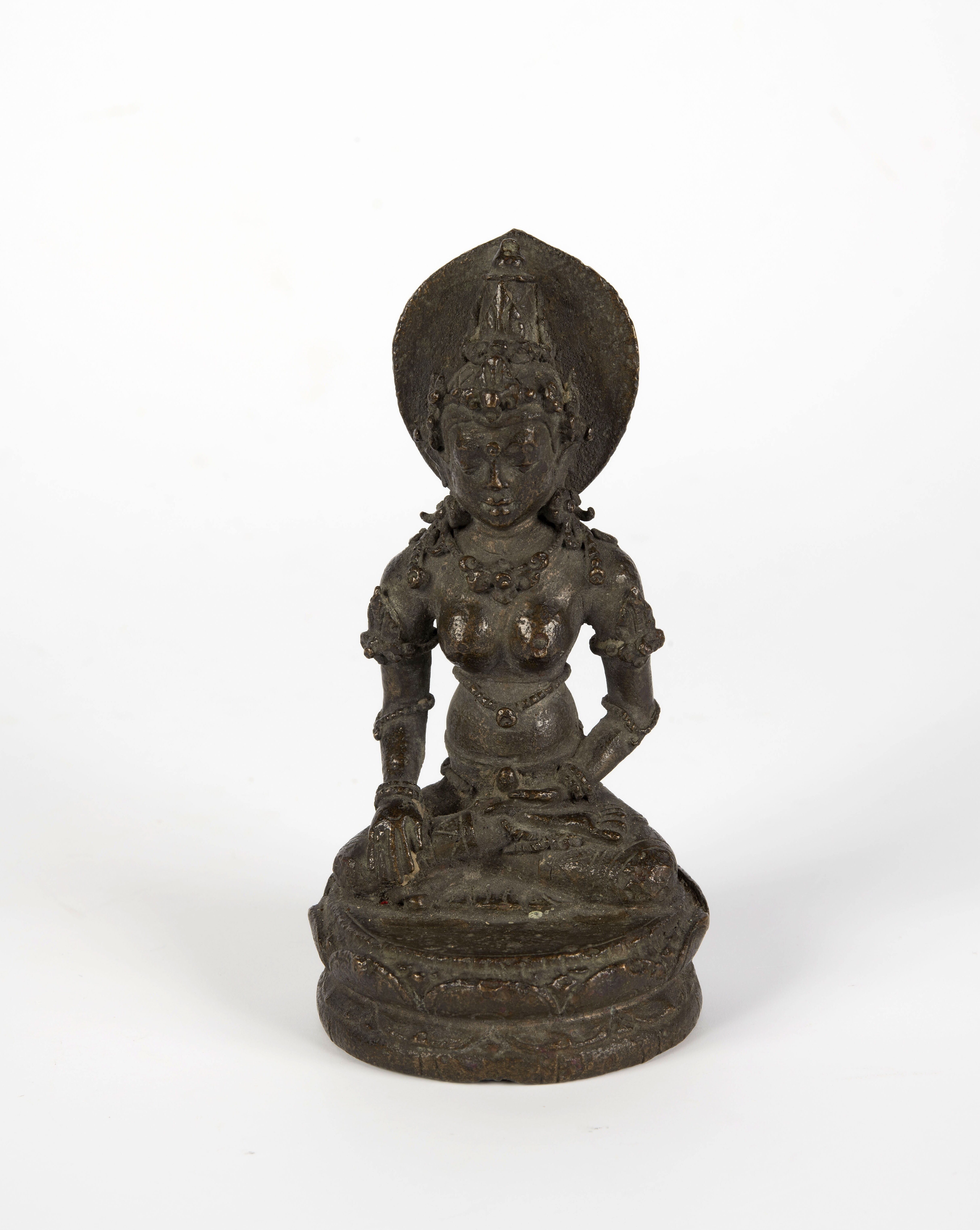 Indo-Javaans bronzen beeldje van een zittende vrouwe...
