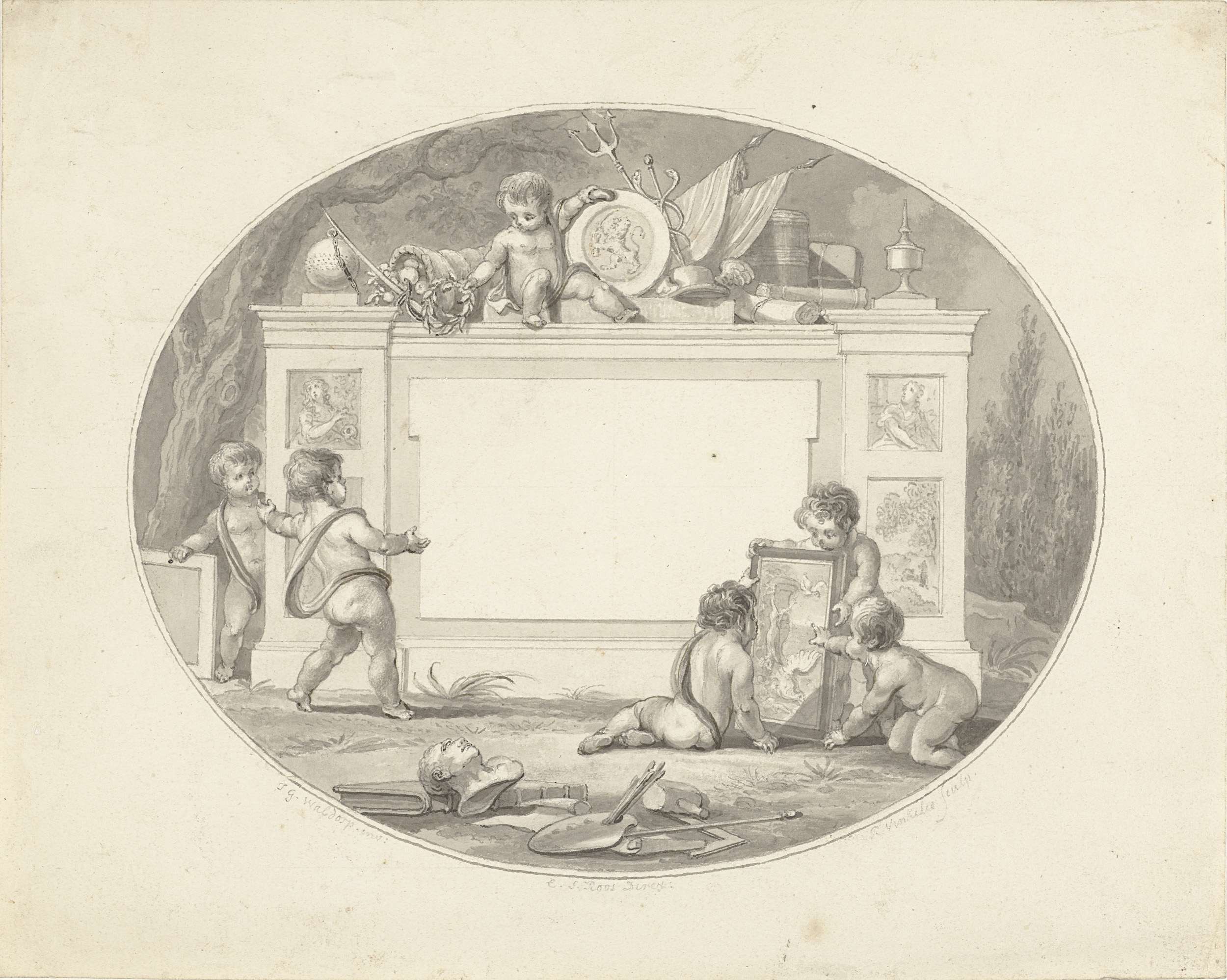 Bokaal met attributen van Bacchus, met aan de voet t...