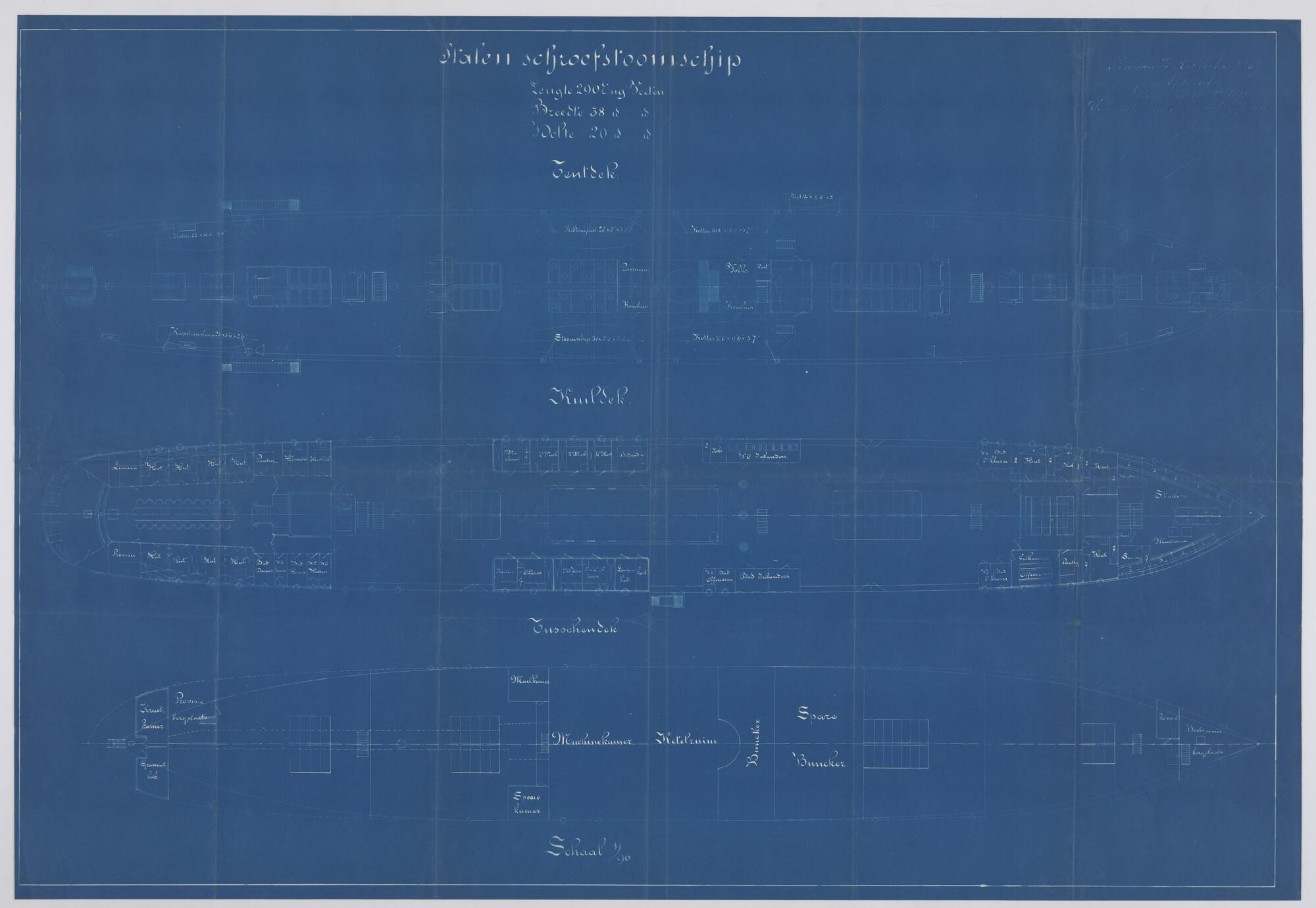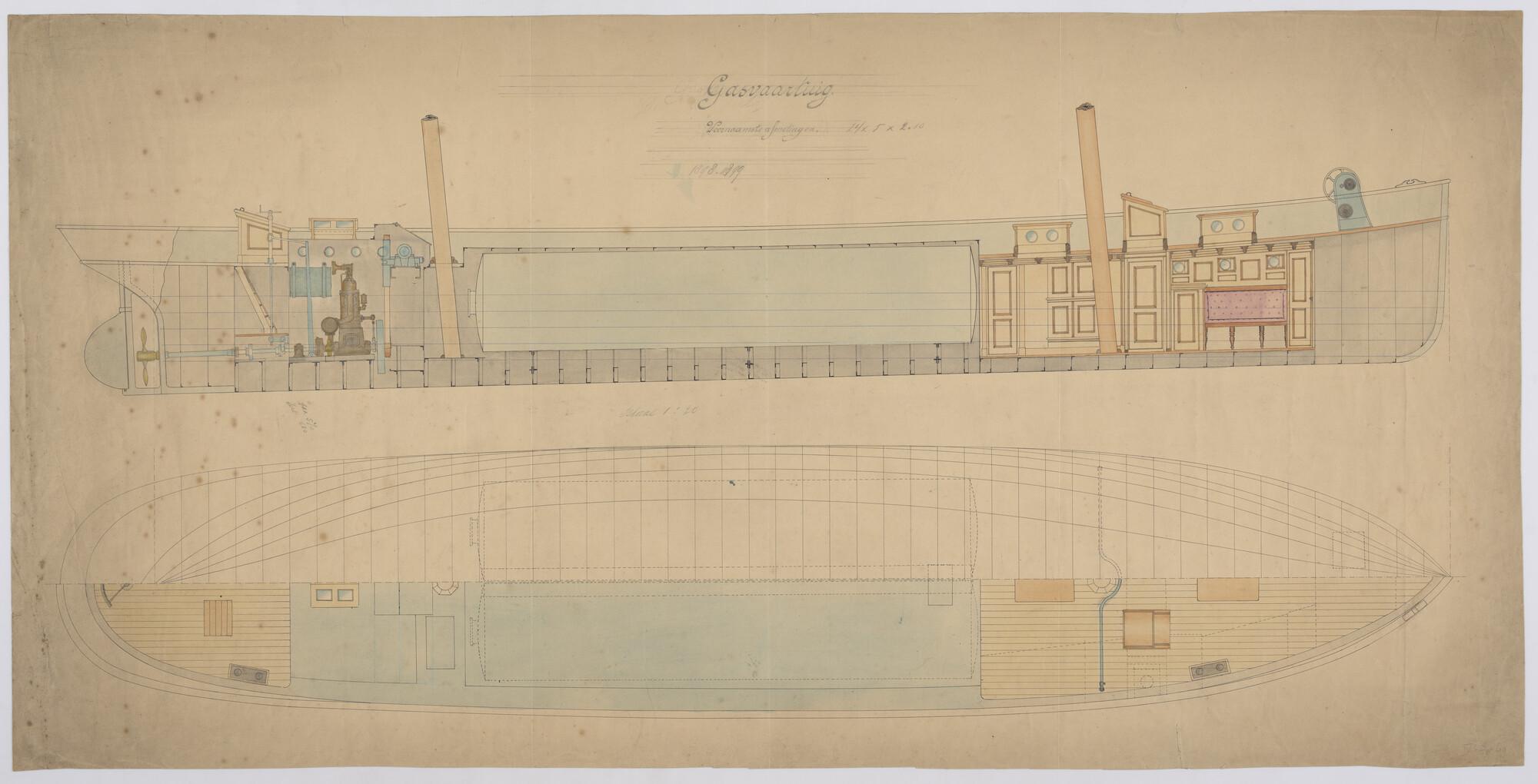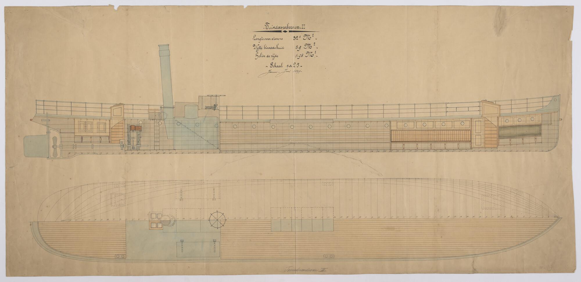 Verticale langsdoorsnede, bovenaanzicht en waterlijn...