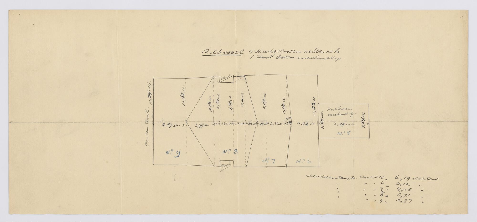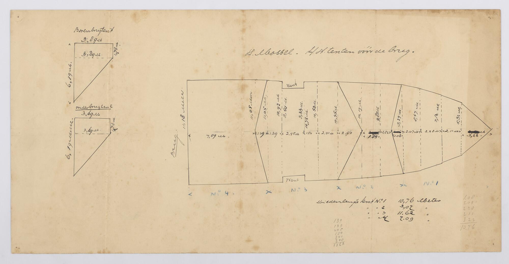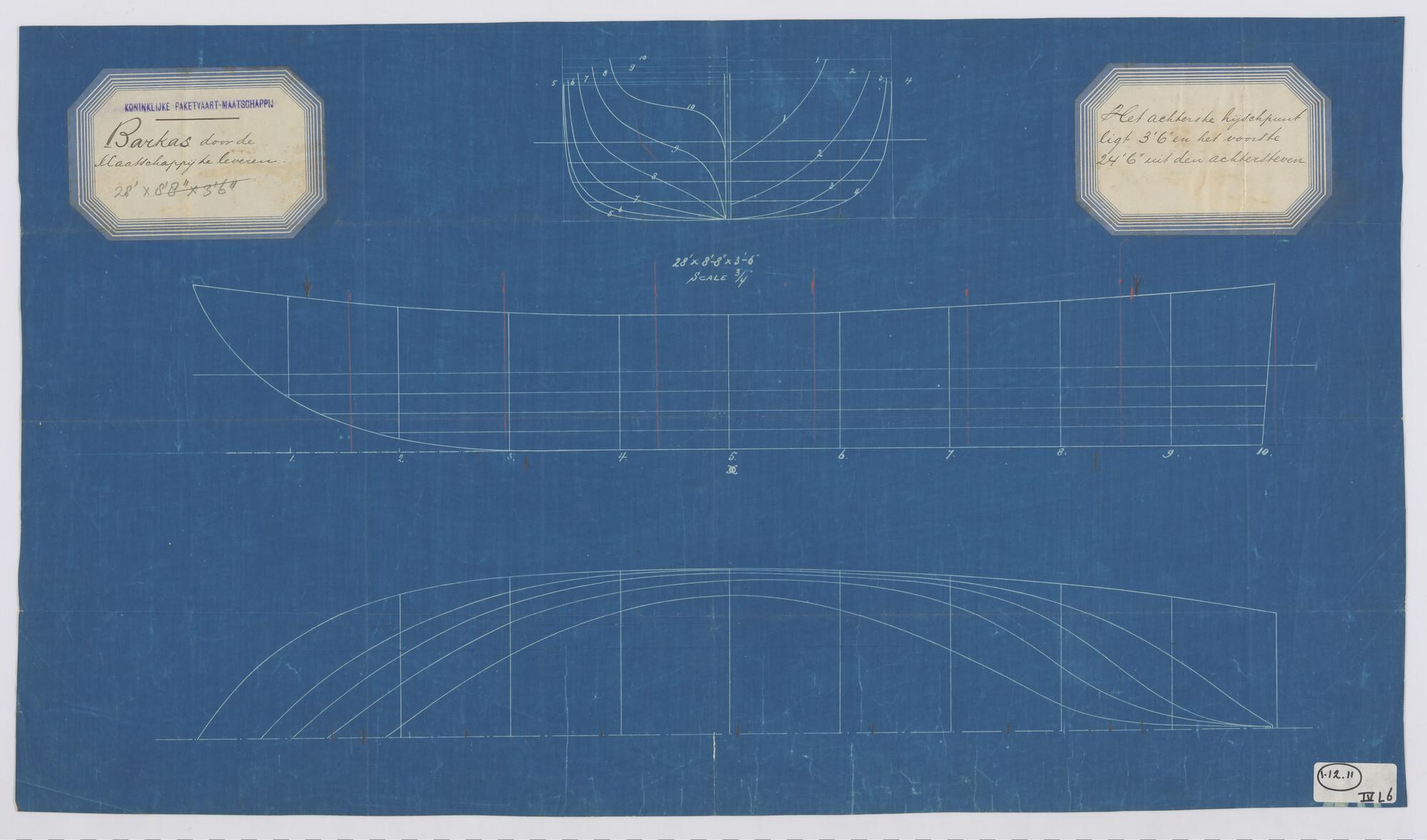 Verticale langsdoorsnede, bovenaanzicht en waterlijn...