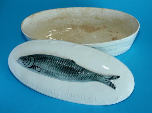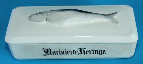 Dekschaal met een haring met tekst: ‘Marinierte Heri...
