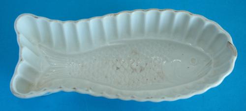 Puddingvorm. Witte aardewerken puddingvorm als een vis.