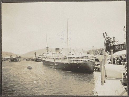 Een man uit Nederlands-Indië hangt over de reling va...
