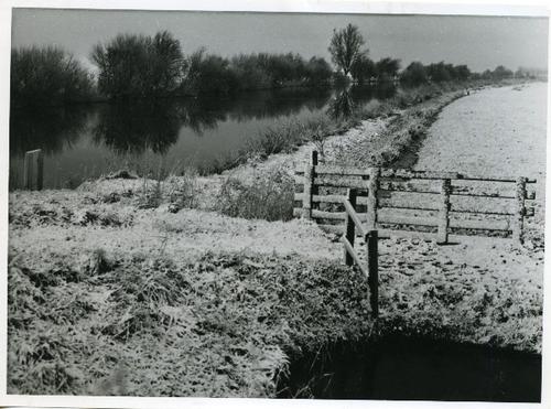 Foto in zwart-wit van een polderdijk langs brede vaa...