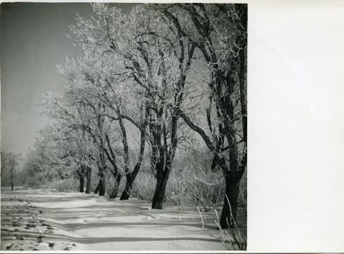 Foto in zwart-wit van berijpte bomen en een dik pak ...