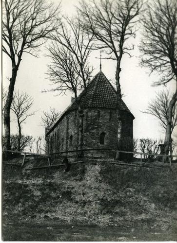 Foto in zwart-wit van een kerkje op een terp door He...