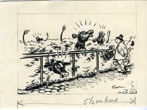 Tekening in zwart-wit van koeien in het stro.