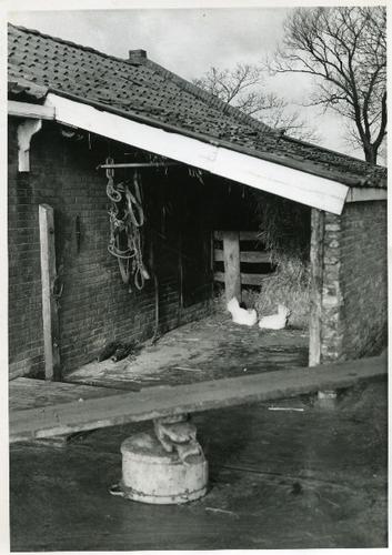 Foto in zwart-wit van een aanbouw aan een schuur doo...