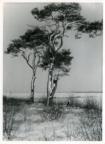 Foto in zwart-wit van dennen in de sneeuw door J.D. ...