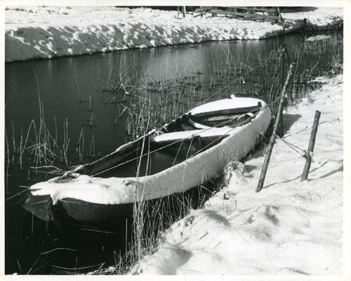 Foto in zwart-wit van een besneeuwde roeiboot in een...