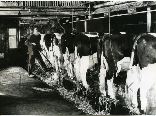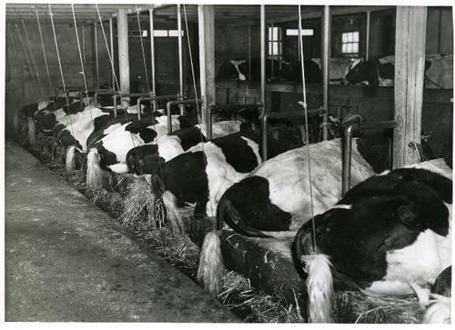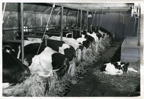 Foto in zwart-wit van koeien op een Friese stal door...
