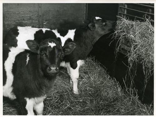 Foto in zwart-wit van twee kalveren in het stro door...