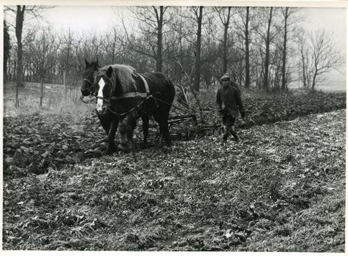 Foto in zwart-wit van een ploeg getrokken door twee ...