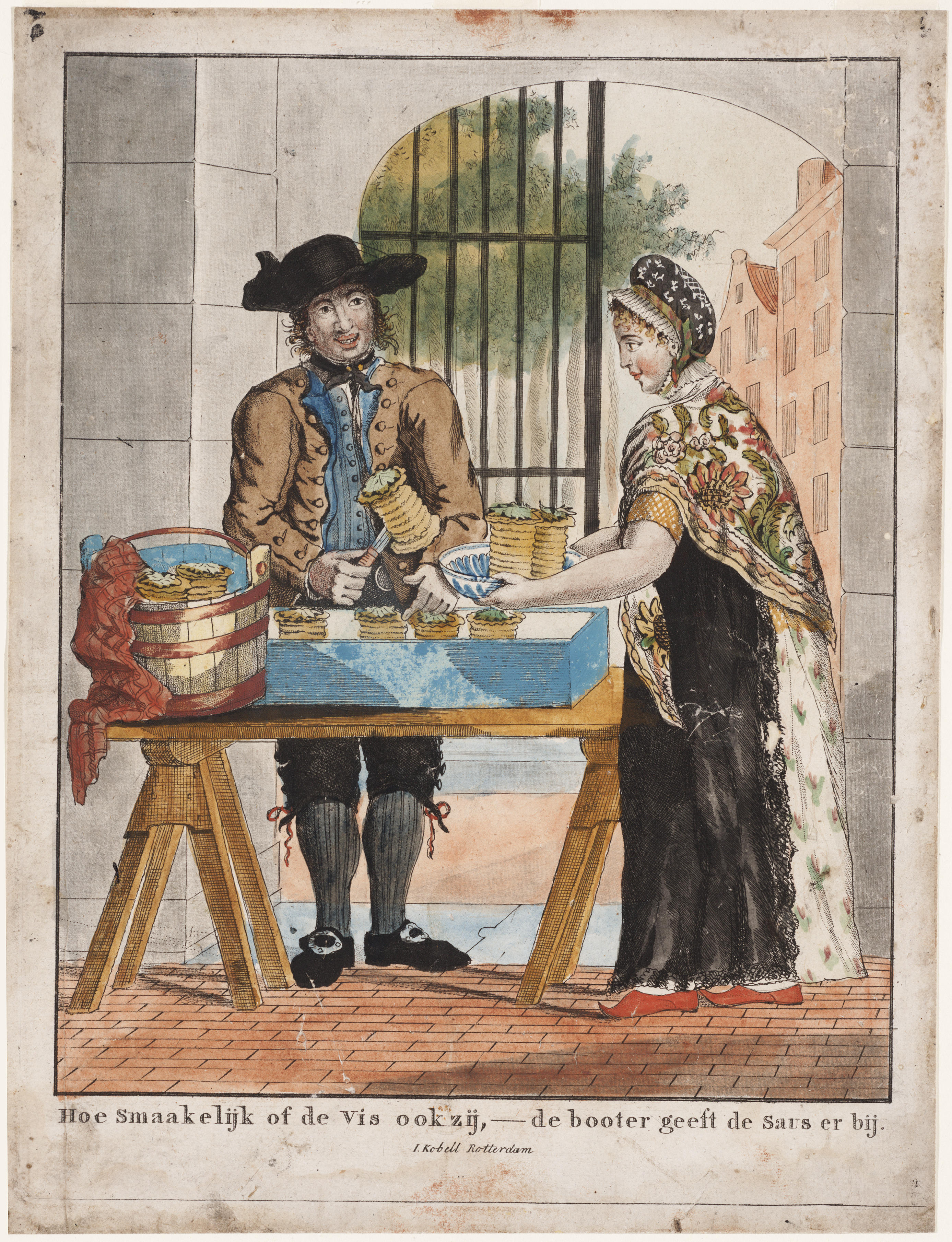 Vrouw verkoopt vis aan man, circa 1820