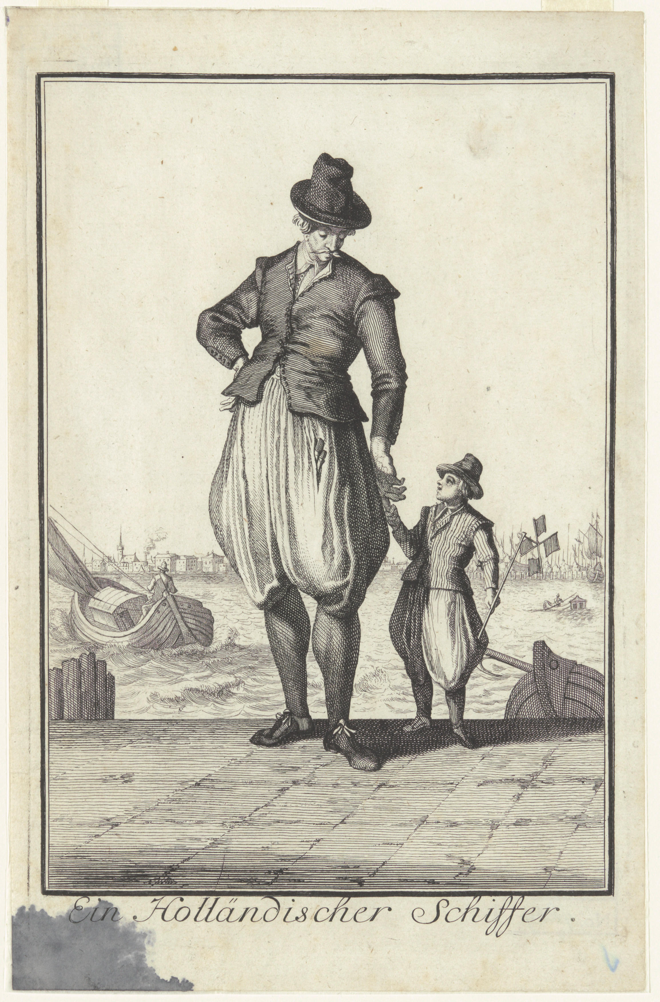Prent van man en jongen op de kade, circa 1700
