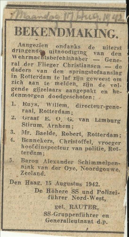 Bekendmaking dat de volgende mensen zijn gefusilleer...