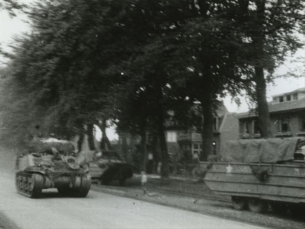 rijdende Britse Shermantank, geparkeerde Dukw's