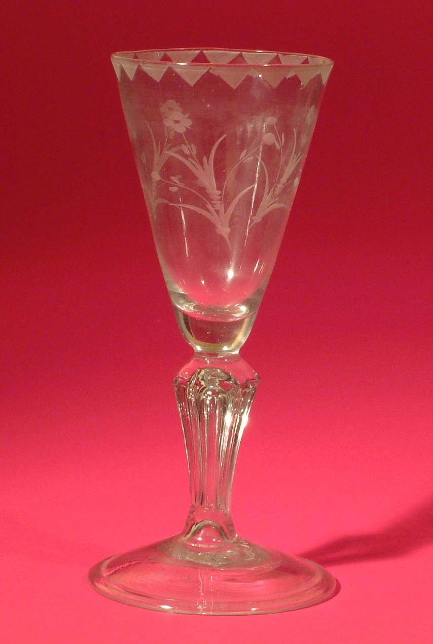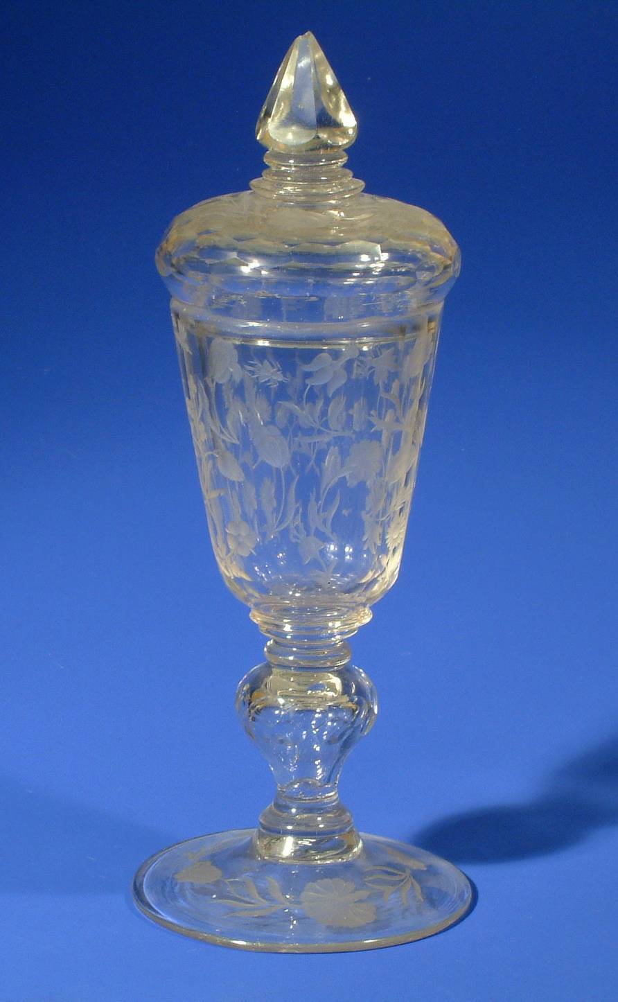 kelkglas met langs de rand een lofwerk van bloemen, ...