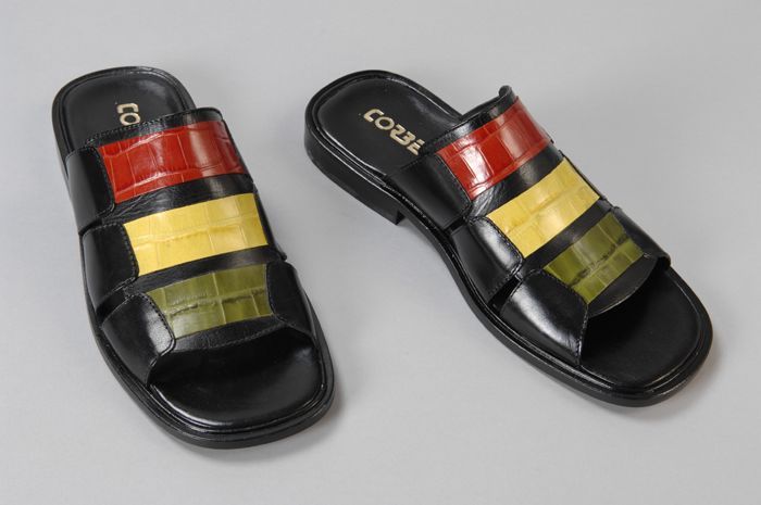Paar zwarte herenslippers, met banden in rood, geel ...
