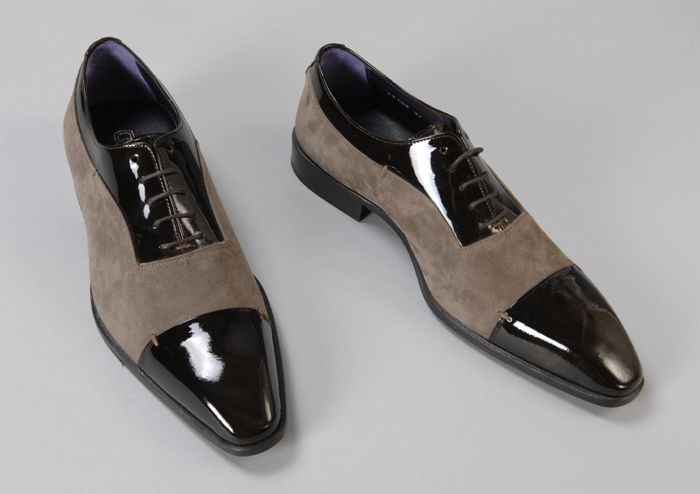 Paar herenschoenen, bruine suède met lak, "Corbeau"