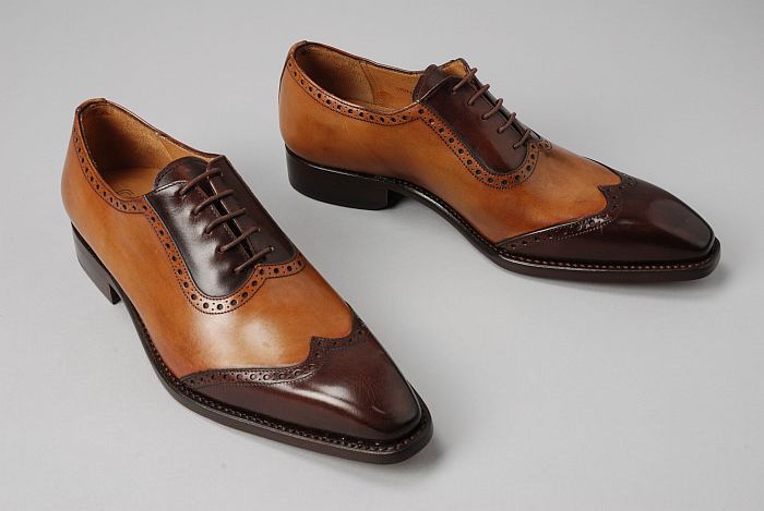 Paar herenschoenen, bruin met wit gevlochten neus, "...