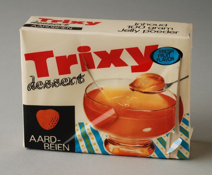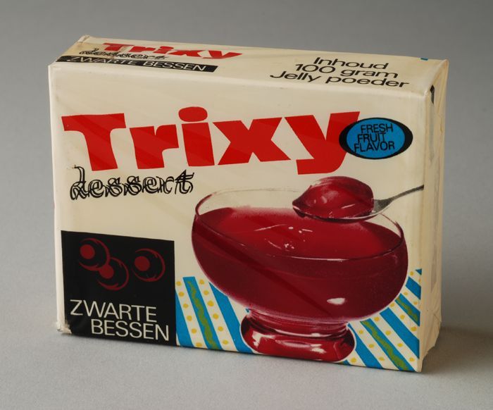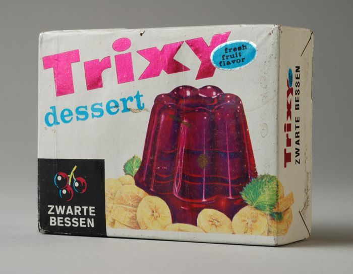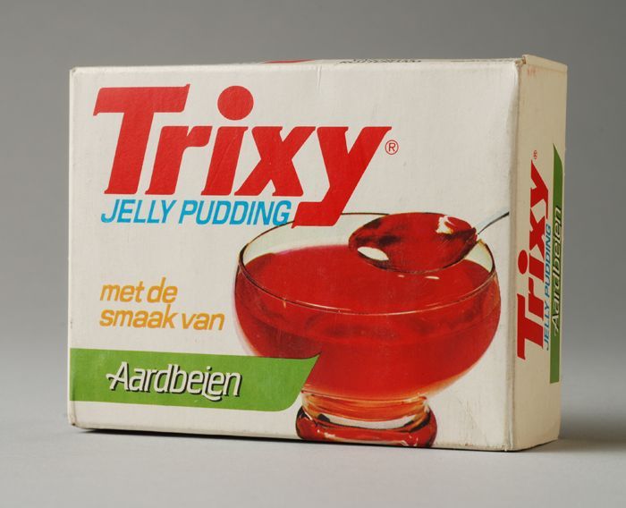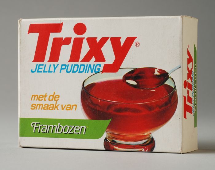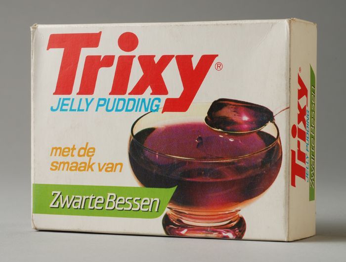 Wit, kartonnen pak TRIXY jelly pudding, zwarte besse...
