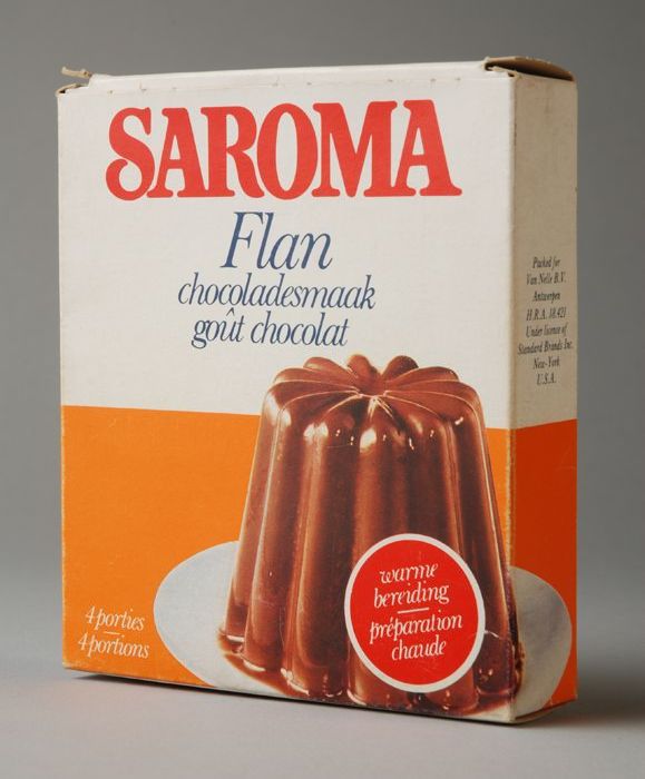 Wit en oranje, kartonnen pak SAROMA flan, chocolades...