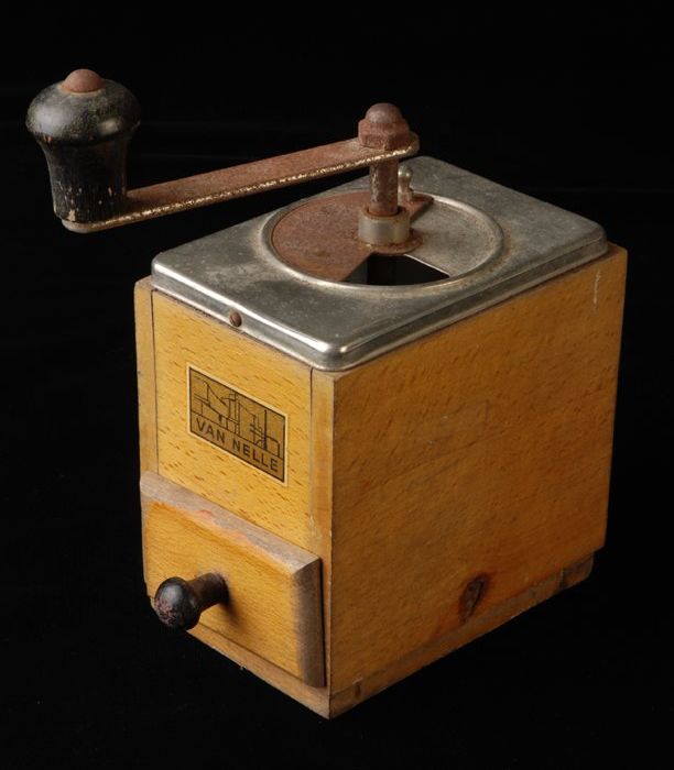 Koffiemolen van "Van Nelle" met afbeelding fabriek